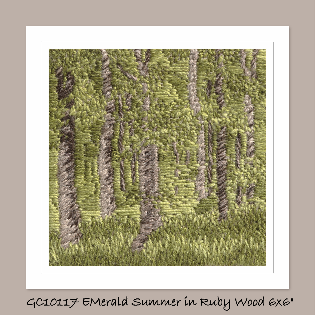 Fine art Greeting Card from original hand embroidery. Emerald Summer in Ruby Wood (150x150mm)